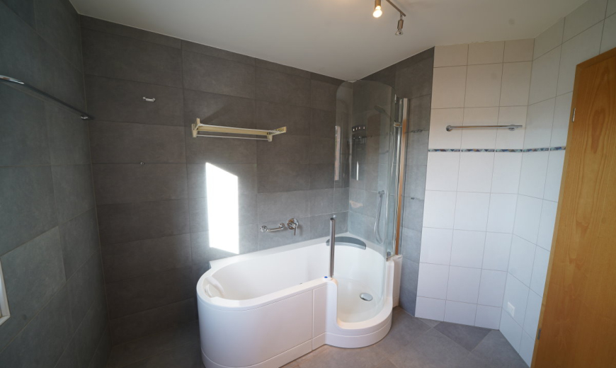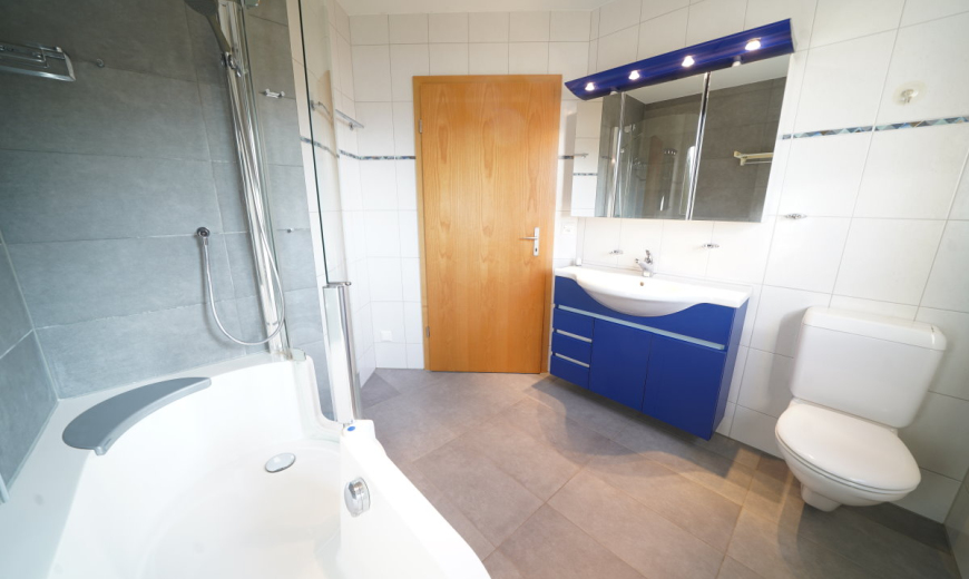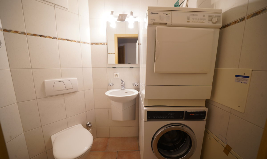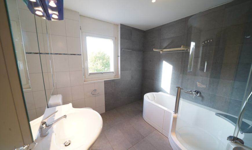 Im Eingangsbereich ist genügend Platz für einen grossen Garderobenschrank. Die Wohnung verfügt zudem über ein Gäste-WC mit Waschmaschine/Tumbler und ein grosses, schönes Badezimmer mit Kombi-Wanne und Fenster.